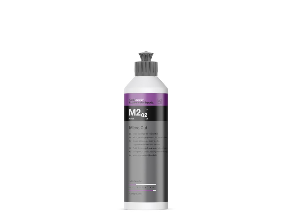 Antihologramová pasta s vysoký leskom Micro Cut M3.02 je pasta s mikročasticami pre strojové leštenie najnovšej generácie na trvalé odstránenie stôp po leštení; hologramoch; jemných škrabancoch až do zrnitosti o veľkosti 4 000 pre všetky druhy lakov (vrátane odolných proti poškriabaniu). Vďaka použitiu vysoko špecializovaných a extrémne homogénnych brúsnych telies sa dosiahne dokonca na tmavých a podobne citlivých farebných odtieňoch pri extrémnych svetelných podmienkach brilantný a trvanlivý vysoký lesk povrchu. Hologramy a jemné škrabance sa mechanicky odstránia. Antihologramová pasta s vysokým leskom Micro Cut M2.02 je obzvlášť výdatná; dá sa dobre vyleštiť a bezo zvyškov odstrániť.