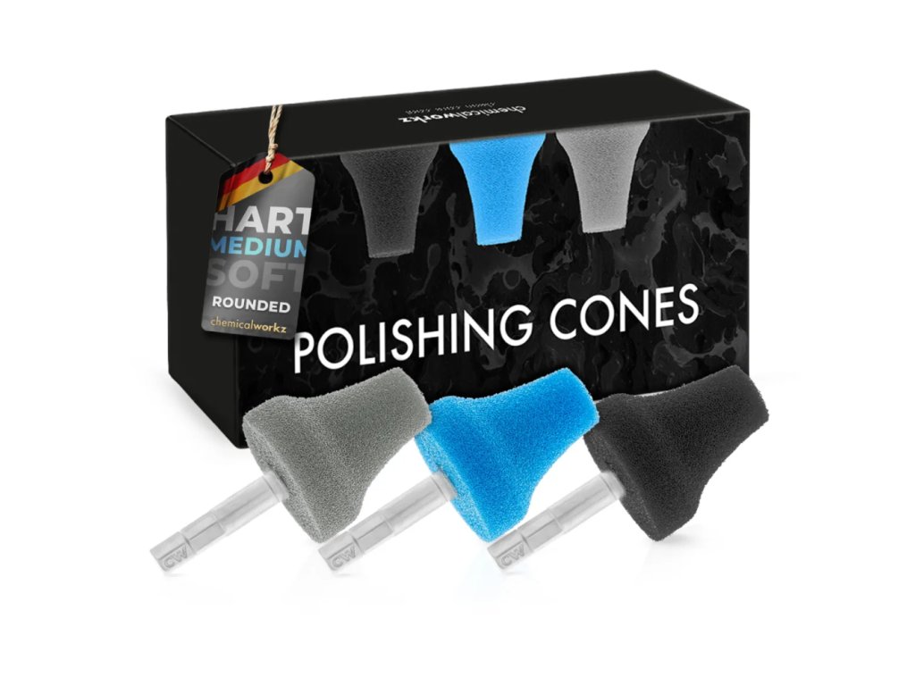 ChemicalWorkz® Polishing Cones Rounded sú ideálnym doplnkom do detailingovej výbavy všade tam, kde sa vyžaduje precízne leštenie ťažko dostupných miest. V praktickej a odolnej úložnej krabičke nájdete tri leštiace kužele s rôznou tvrdosťou – tvrdý (sivý), stredný (modrý) a mäkký (čierny).