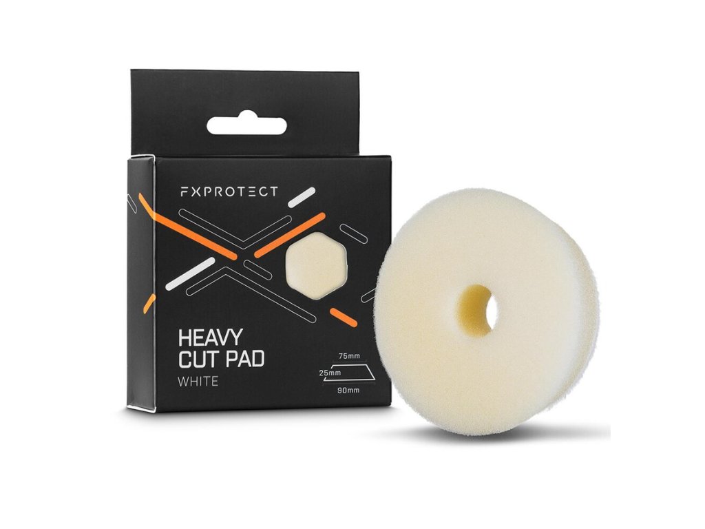 FX Protect Heavy Cut Pad White je profesionálny veľmi tvrdý penový leštiaci kotúč na lakované diely karosérie vozidiel s vysokým stupňom rezu. Kotúč je vyhotovený z vysoko kvalitného penového materiálu s otvorenou štruktúrou, ktorá zaručuje perfektné odvádzanie tepla vznikajúceho počas leštenia. Okraj leštiaceho kotúča je zrezaný pod uhlom 60° na dosiahnutie vysokej torznej tuhosti a stability kotúča. Stredový otvor priemeru 20 mm uľahčuje vycentrovanie kotúča na unášači. Vysokokvalitný suchý zips s s hustotou až 280 g/m² zaručuje mimoriadne pevné spojenie s unášačom leštičky. Lichobežníkový tvar kotúča uľahčuje leštenie v ťažko dostupných miestach a zvyšuje pracovný komfort. Kotúč je určený na leštenie pomocou orbitálnych leštičiek typu DA, je vhodný na použitie s vysoko alebo stredne abrazívnymi leštiacimi pastami, alternatívne aj jednokrokovými, napr. FX Protect Heavy Cut alebo FX Protect Medium Cut / One Step.