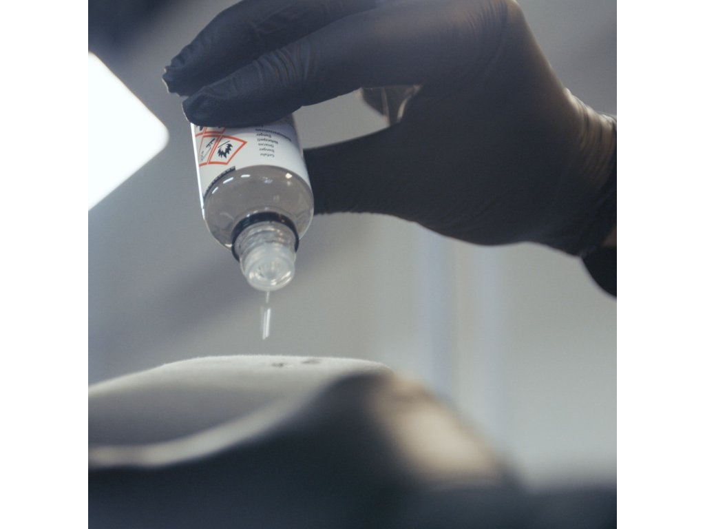 - Odmastnite lak s čistou handričkou z mikrovlákna s pomocou prípravku na odstraňovanie silikónu a vosku zriedený vodou v pomere 1:4 alebo sprejom a znova utrite ďalšou novou handričkou z mikrovlákna. Toto je jediný spôsob, ako úplne odstrániť povrchovo aktívne látky, sušiace látky, oleje v leštidlách a tak ďalej a vyhnúť sa problémom s priľnavosťou s Ceramic body Cb0.01.