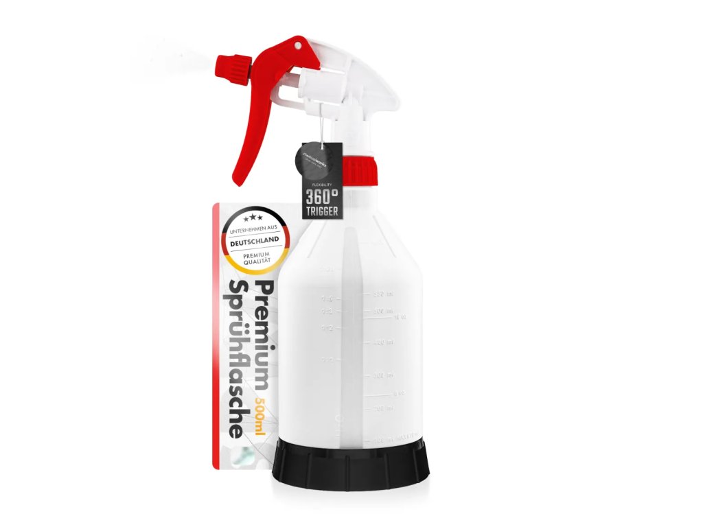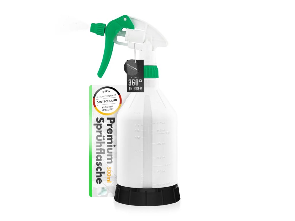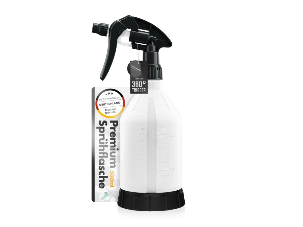 ChemicalWorkz Sprühflasche s objemom 500 ml a kvalitným 360° Canyon Trigger systémom je fľaša navrhnutá pre používateľov, ktorí vyžadujú veľké kapacity, presné dávkovanie a spoľahlivú funkčnosť pri každodennom používaní. Robustná HDPE konštrukcia zaručuje dlhú životnosť, vďaka čomu je fľaša ideálna pre profesionálnu starostlivosť o automobil, dielne aj náročné domáce použitie.