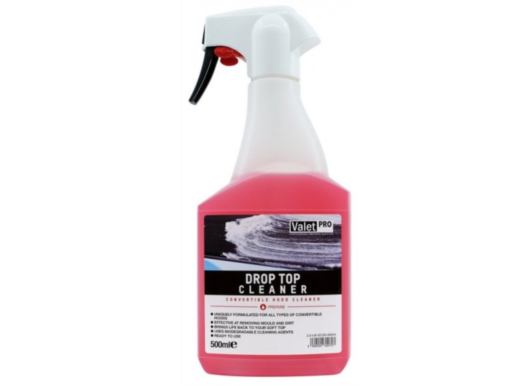 ValetPro Drop Top Cleaner je čistič textilných striech, ktorý bol navrhnutý tak, aby bol vysoko efektívny voči cestnej špine a plesniam a pritom ponúkal komfort pH neutrálneho prípravku, ktorý je oproti alkalickým čističom šetrnejší k povrchom. Po vyčistení povrchu odporúčame následne strechu kabrioletu naimpregnovať.